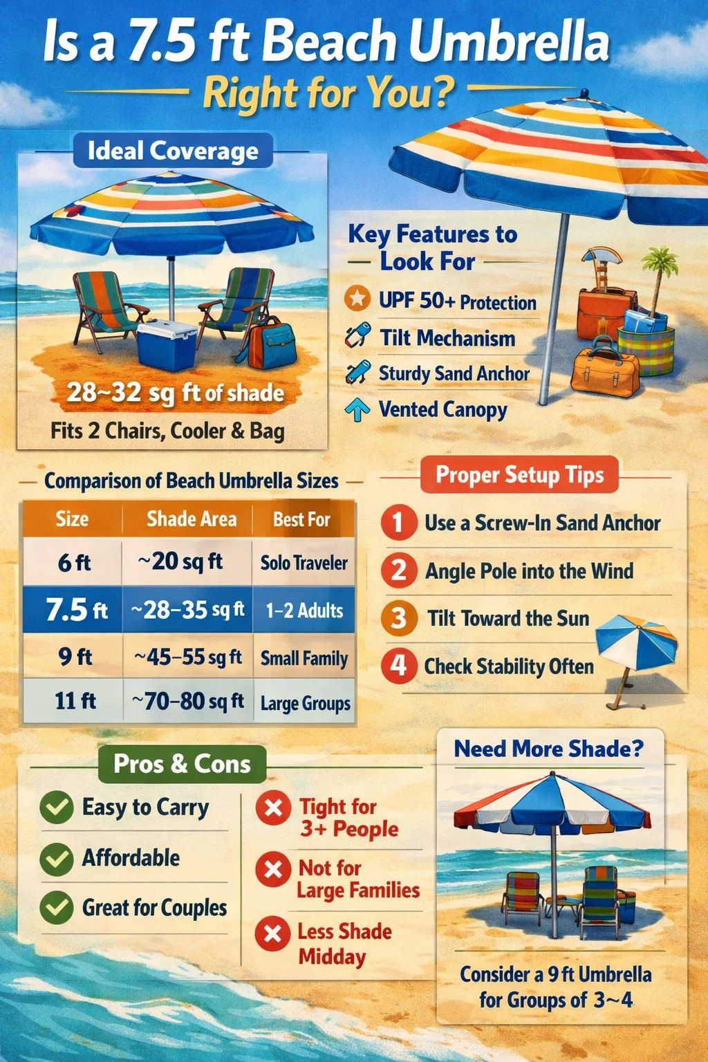짧은 대답: 7.5피트 해변 우산이 시장에서 가장 인기 있는 크기인 데는 그럴 만한 이유가 있습니다. — 대략 28~32평방피트의 그늘진 공간을 차지하며 직사광선에 아무도 앉지 않고도 해변용 의자 2개, 쿨러, 가방 하나를 놓기에 충분합니다. 혼자 쇼핑하거나 커플을 위해 쇼핑하는 경우 7.5피트 캐노피가 휴대성과 실용적인 커버리지 사이에서 최적의 위치에 있습니다. 3명 이상의 그룹인 경우 9피트 옵션을 살펴보는 것이 좋지만 대부분의 해변 여행에서는 7.5피트가 적합합니다.