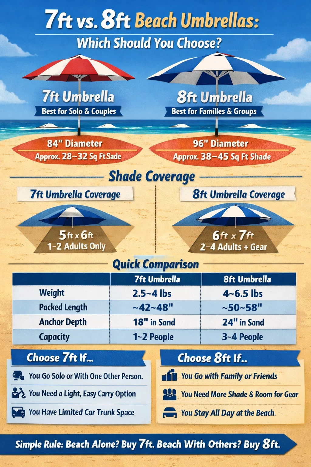 해변용 파라솔을 구매하고 7피트 또는 8피트가 더 나은 선택인지 궁금하신 경우, 이에 대한 직접적인 대답은 다음과 같습니다. 8피트 해변 우산은 3명 이상의 그룹에 적합하고, 7피트 우산은 휴대성을 우선시하는 개인이나 커플에게 더 현명한 선택입니다. 이 두 크기 사이의 캐노피 직경 차이는 사용 가능한 그늘의 의미 있는 간격으로 해석되며, 더운 여름 오후에 가족 전체를 시원하게 유지하려고 할 때 그 간격이 중요합니다.