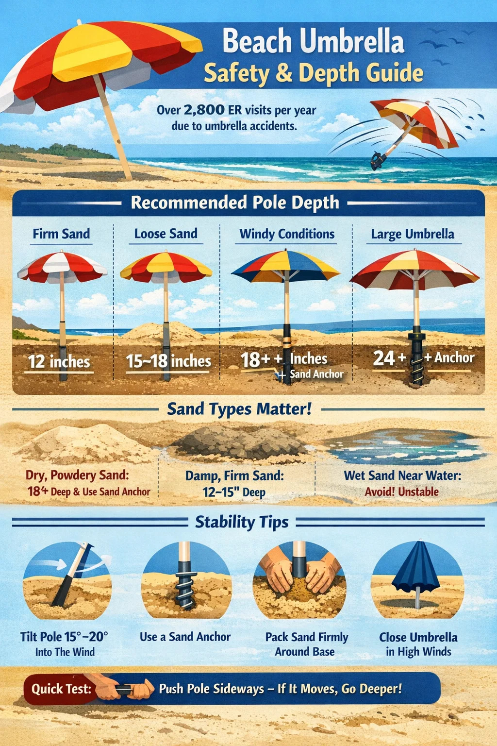 이 기사에서는 깊이가 중요한 이유, 다양한 모래 조건에서 깊이를 달성하는 방법, 설정을 안전하게 유지하기 위해 깊이에만 의존하지 않도록 안정성에 영향을 미치는 다른 요소를 자세히 설명합니다.