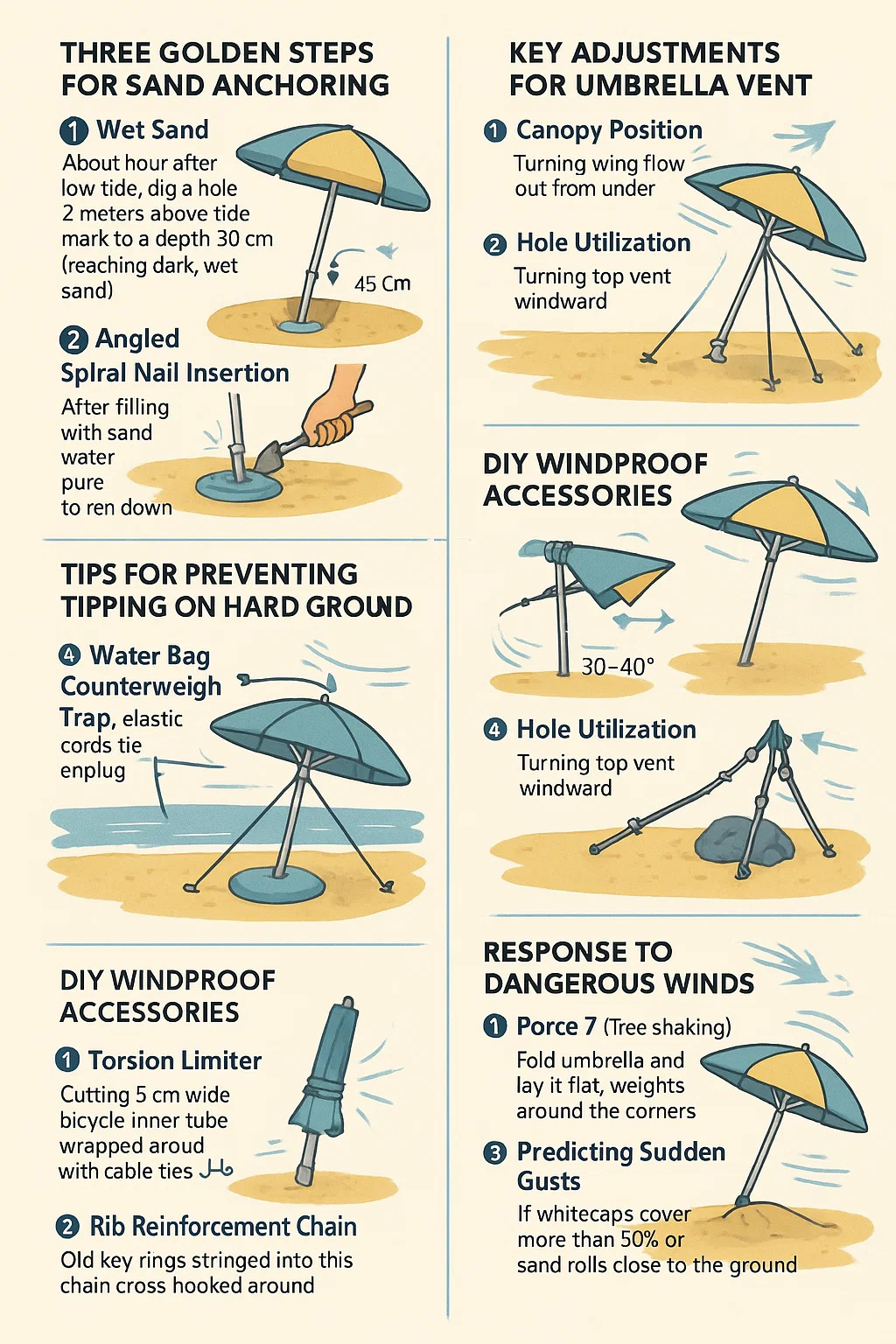 다음은 안전한 설치를 위한 실용적인 설치 팁입니다. 해변 우산 안정적이고 방풍 기능이 있습니다.