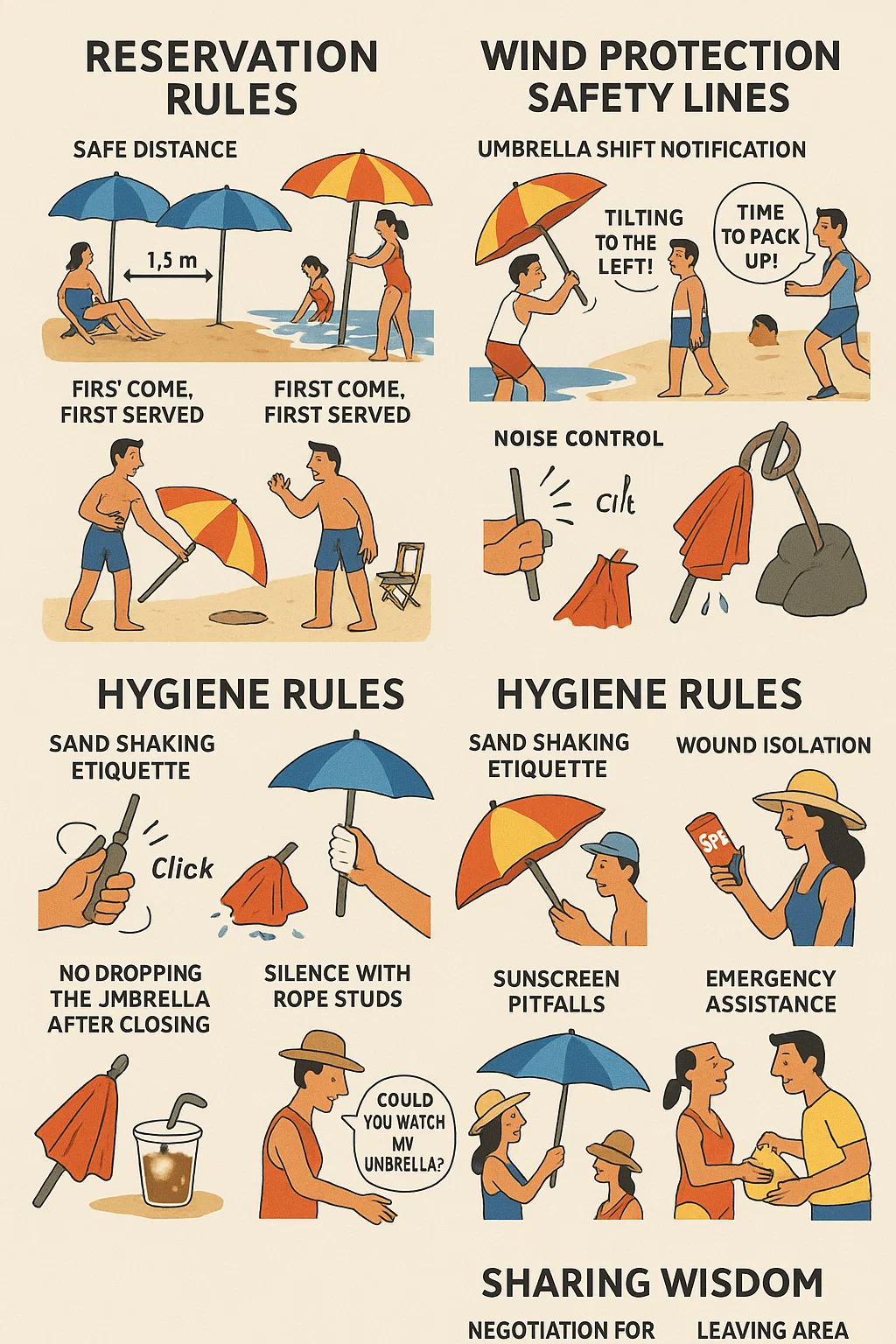 안전 거리: 이웃의 우산과 해변용 의자 두 개 너비(약 1.5m)의 거리를 유지하세요. 자신의 우산 그림자가 타인의 영역에서 벗어나면 사과하고 그에 맞게 조정하세요.