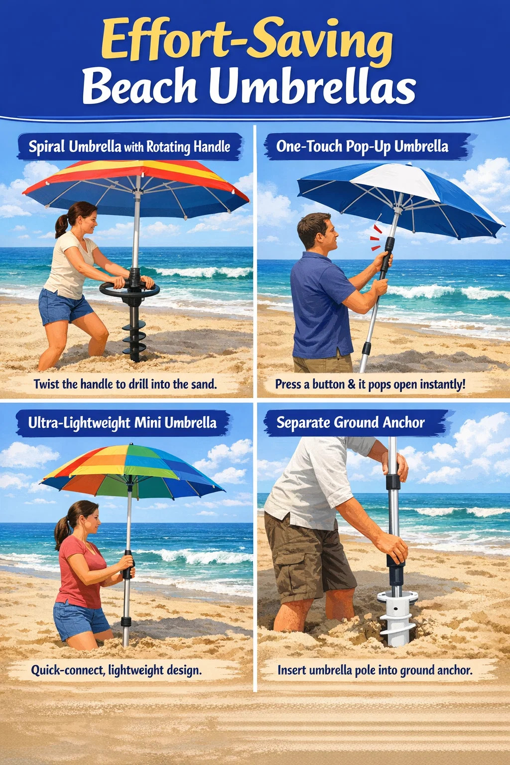 수고 절약 효과: 지렛대의 원리를 이용하여 힘이 약한 여성이나 노인도 쉽게 우산을 모래 깊이 묻을 수 있습니다.